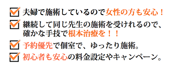 当院は対症療法ではなく根本療法で施術していく治療院です。 つらい「首、肩、背中、腰、膝」でお悩みの方、それは身体の「ゆがみ」からくる筋肉のコリが原因してるかも? これらの、肩こり、腰痛、頭痛などの悩みを一緒に根本から見直していきましょう! 筋肉の“ほぐし”をとり入れながら諸症状の原因と考えられる骨盤や背骨の変位「ゆがみ」を整える、体に優しく心地よい施術です。下は10代から上は80代と幅広くご利用頂いただいております。