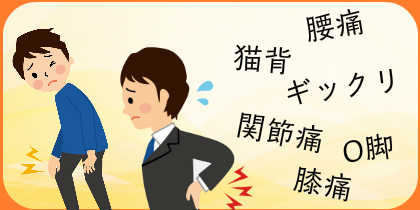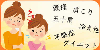 肩こり、腰痛、頭痛、耳鳴り、四十肩、五十肩、神経痛、関節痛、ひざ痛、O脚、肥満、むくみ、猫背、不眠症、ヘルニア、ダイエット、小顔矯正、骨盤矯正