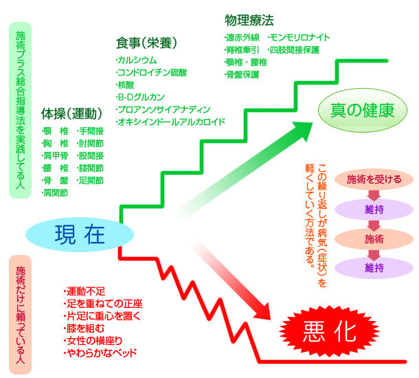 改善した体質・骨格を維持する段階です。施術ペースは月1回程度ですが、年齢や生活習慣によっては、運動・栄養物理療法を継続する必要があります。